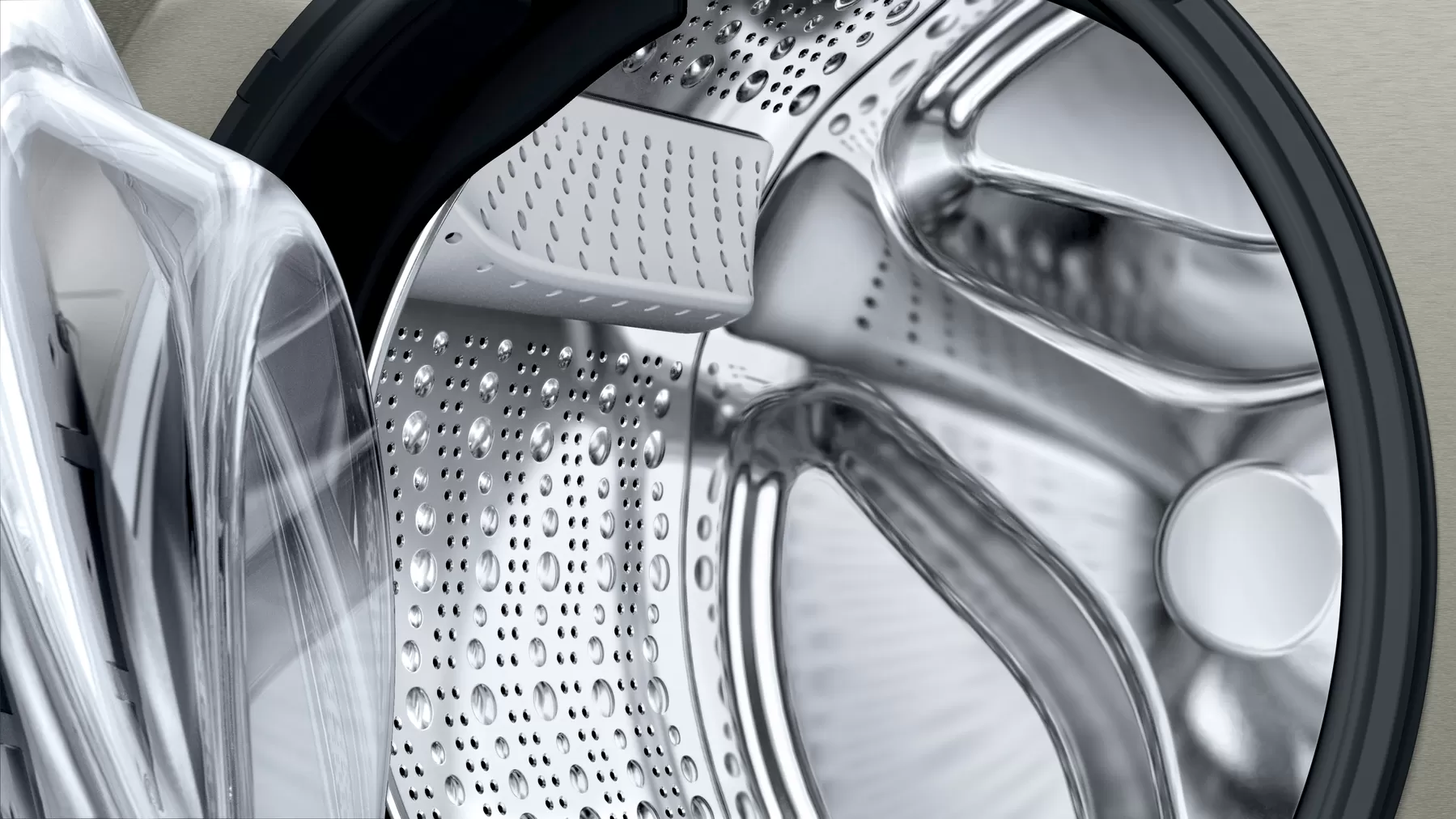 Das innovative AntiVibration Design der Seitenwände ist nicht nur ein Blickfang: Das System bietet auch mehr Stabilität und reduziert Vibrationen. Eine optimale Dämmung reguliert das Geräuschaufkommen, sodass die Waschmaschine selbst im Schleudergang besonders leise ist.